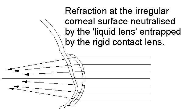A rigid contact lens retains a fluid reservoir between itself and the front surface of the cornea. The front of the lens becomes the new principal focussing surface with minimal further refraction at the cornea because the refractive index of the fluid reservoir is very close to that of the cornea. There may also be some added regularisation of the corneal surface if there is some contact between the lens and the cornea, provided this can be tolerated. Thus a rigid contact lens corrects most of the keratoconic distortions without the need to incorporate a toroidal element.