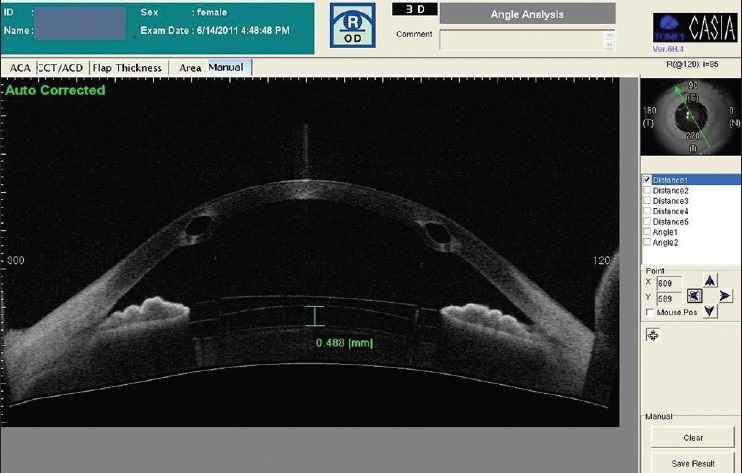Figure 3, published in the Indian Journal of Ophthalmology is an optical coherence tomography (OCT) image illustrating an ICL just vaulting the anterior surface of the crystalline lens. ICRSs have also been inserted into the corneal stroma.